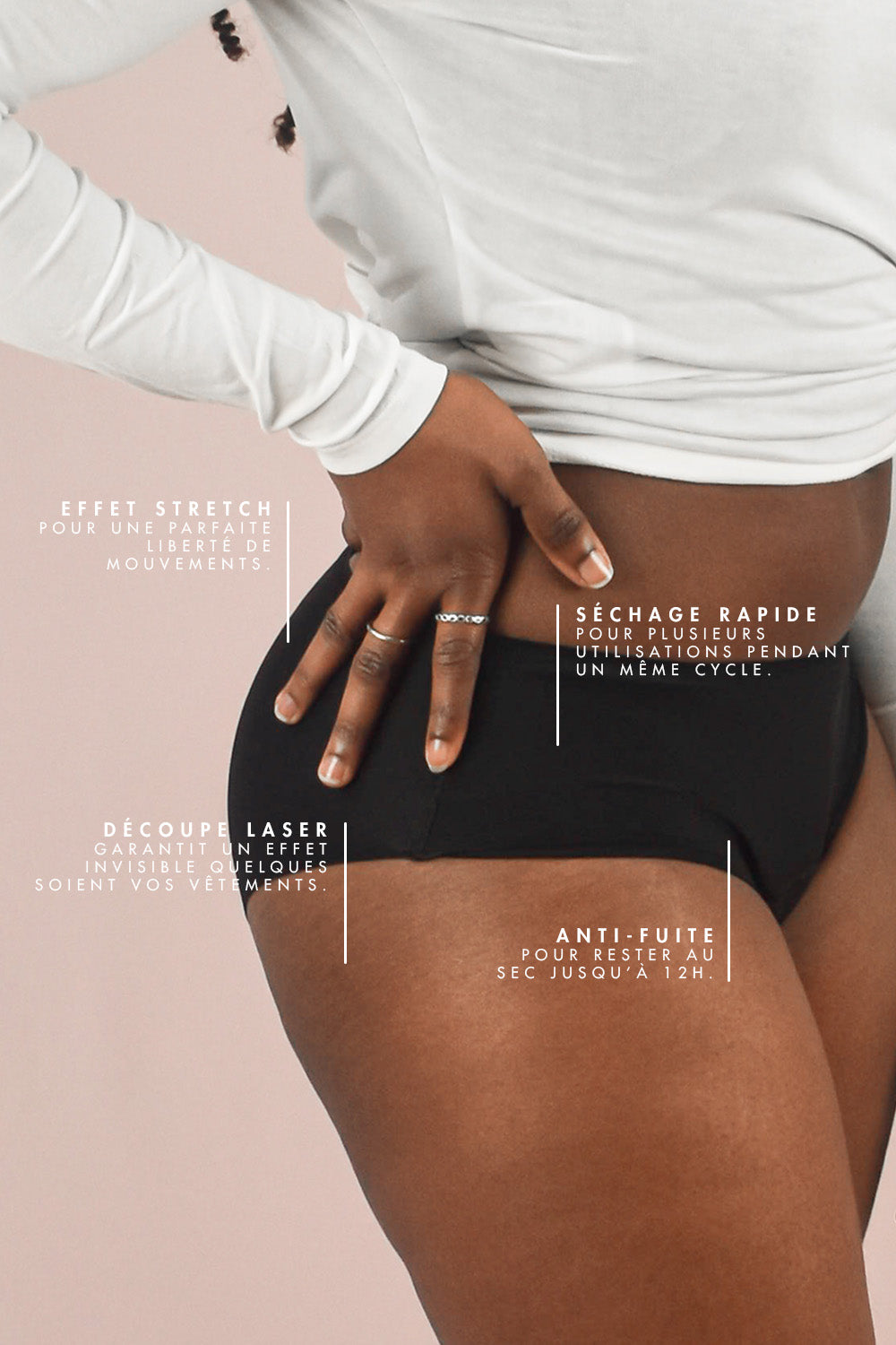 Pour les jours de flux abondant ou la nuit, privilégiez une coupe plus couvrante (shorty, taille haute) pour plus de sécurité.